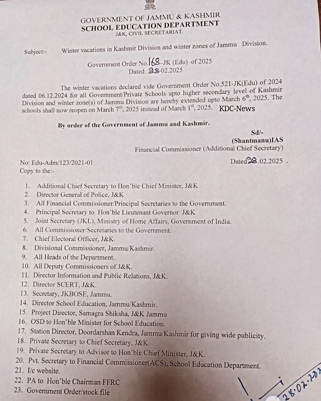 Talking to News agency—Kashmir News Observer (KNO), Itoo said, the schools in the Valley will reopen on March 7.